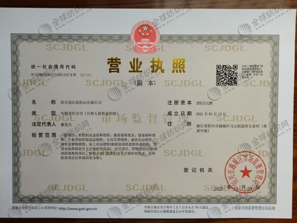 | 统一社会信用代码/营业执照注册号: | 91330602MA2JRGHFXW | 名称: | 绍兴景臣纺织品有限公司 |